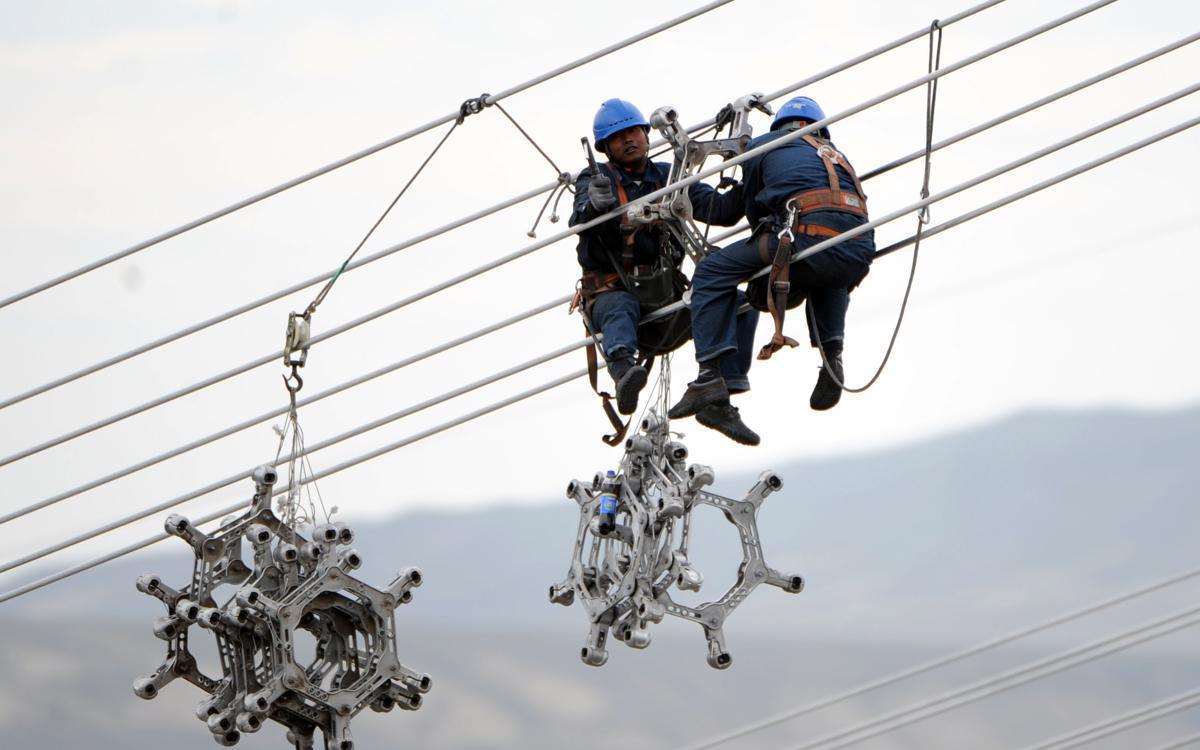 A State Grid Xinjiang Electric Power Co team works on the UHV power transmission line in Karamay, Xinjiang Uygur autonomous region. [Photo provided to chinadaily.com.cn]