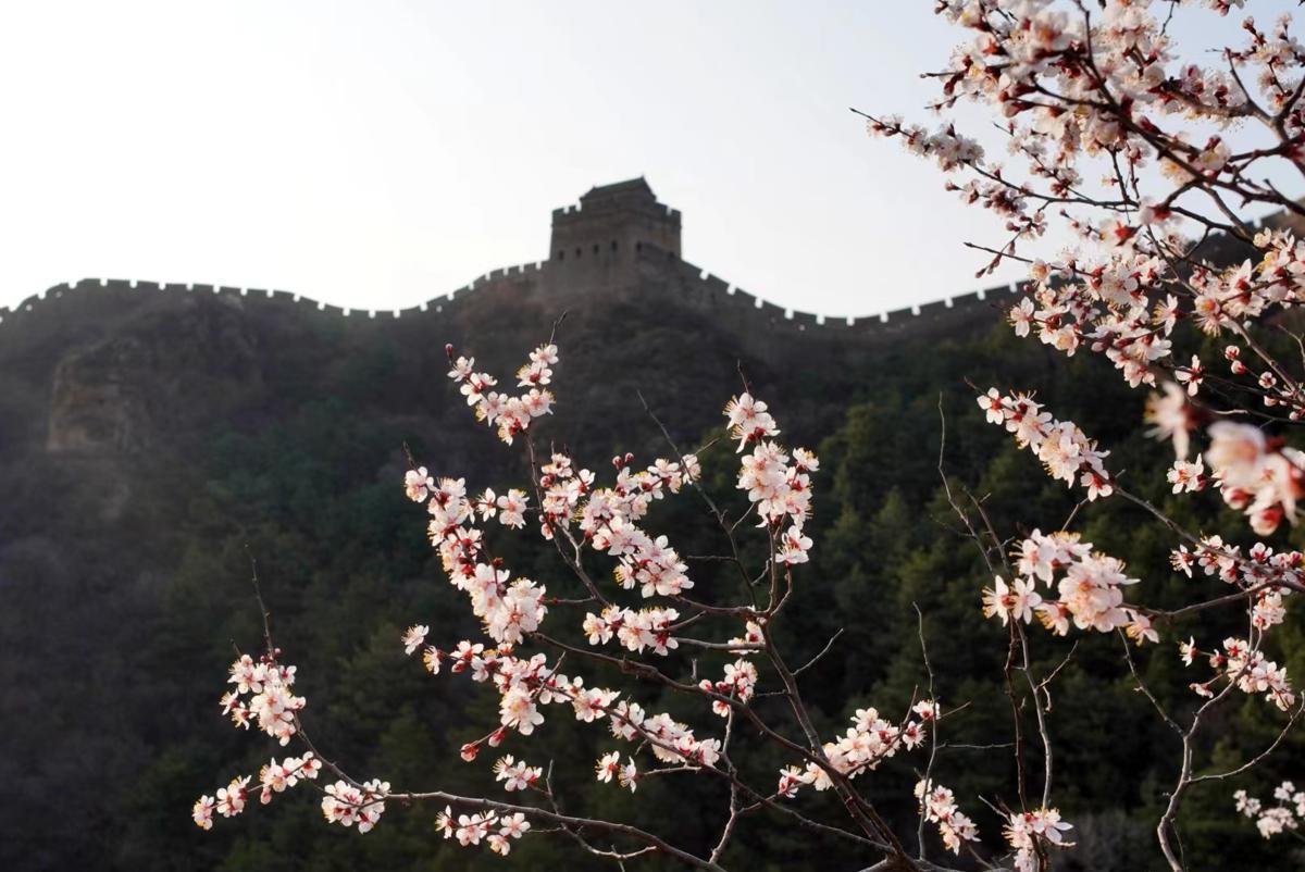 Apricot blossoms are in full bloom at the Jinshanling section of the Great Wall in Luanping county, Chengde, North China's Hebei province. [Photo provided to chinadaily.com.cn]