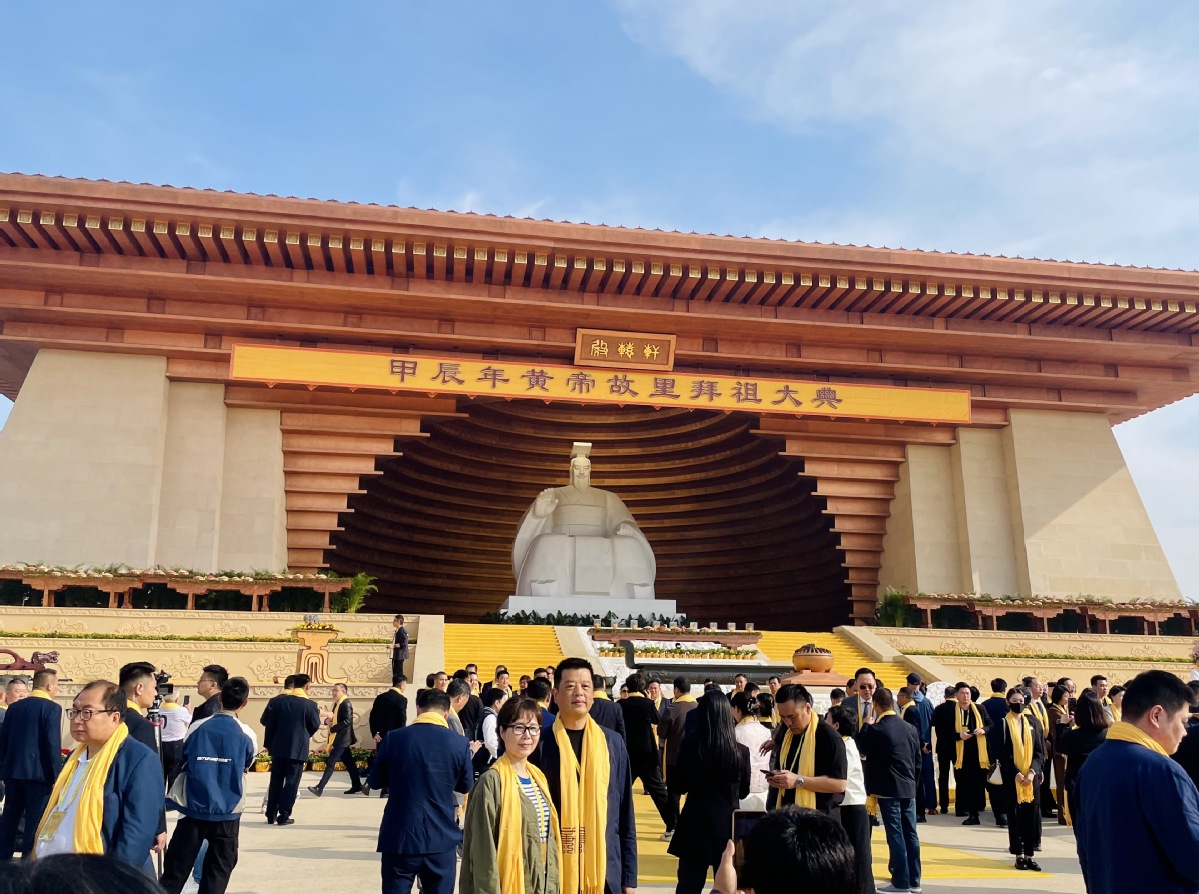 Guests take photos in the square in front of the giant statue of the Yellow Emperor before the ceremony began. [Photo by Wang Jing/chinadaily.com.cn]