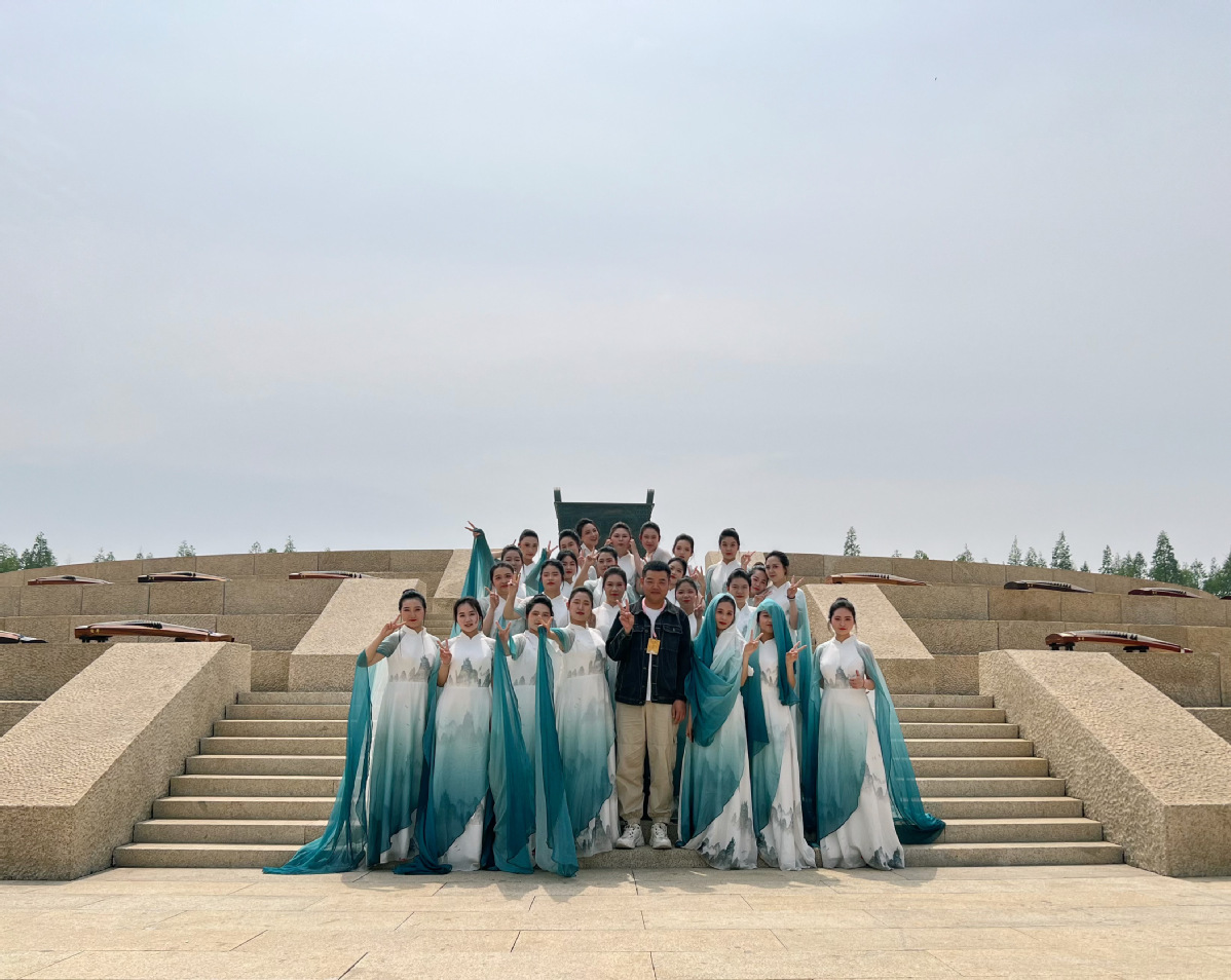 Zhou Xinyi, Deng Nan and the performance team take a group photo together after the ceremony. [Photo provided to chinadaily.com.cn]
