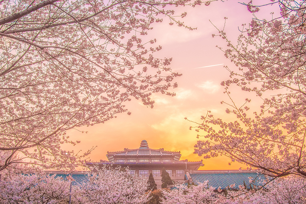 In March, the cherry blossoms were in full bloom at Wuhan University. The flowers resembled pink clouds, forming a dreamy landscape.