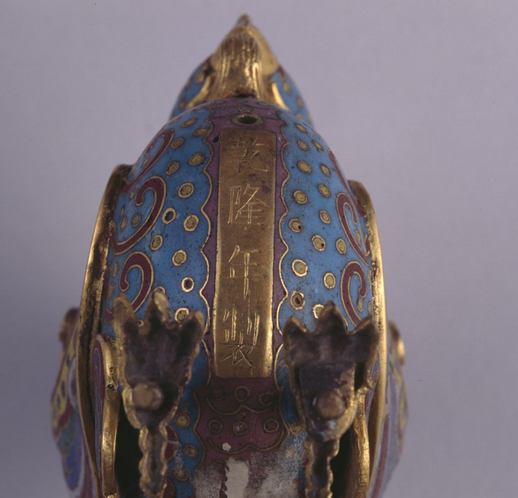 18th-century cloisonné artifact in the shape of a mythical chicken holding a zun vessel