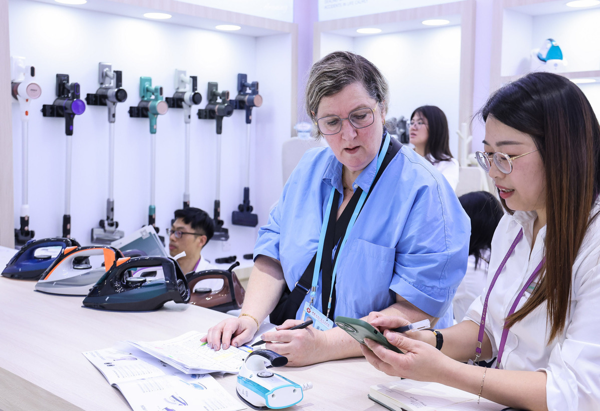 A visitor talks with an exhibitor at the home accessories' exhibition area during the 135th session of the China Import and Export Fair in Guangzhou, Guangdong province on April 15, 2024. [Photo/Xinhua]