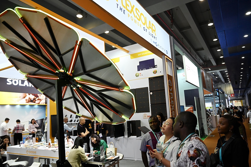 Visitors learn about a tree-shaped light during the 135th session of the China Import and Export Fair in Guangzhou, Guangdong province on April 15, 2024. [Photo/VCG]