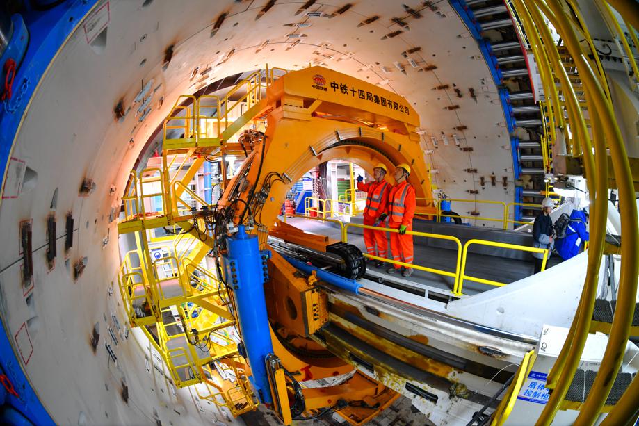 Engineers operate the tunnel boring machine to begin construction of the Suzhou East Tunnel in Suzhou, Jiangsu province, on Thursday. [Photo/LIU FUCHANG FOR CHINA DAILY]