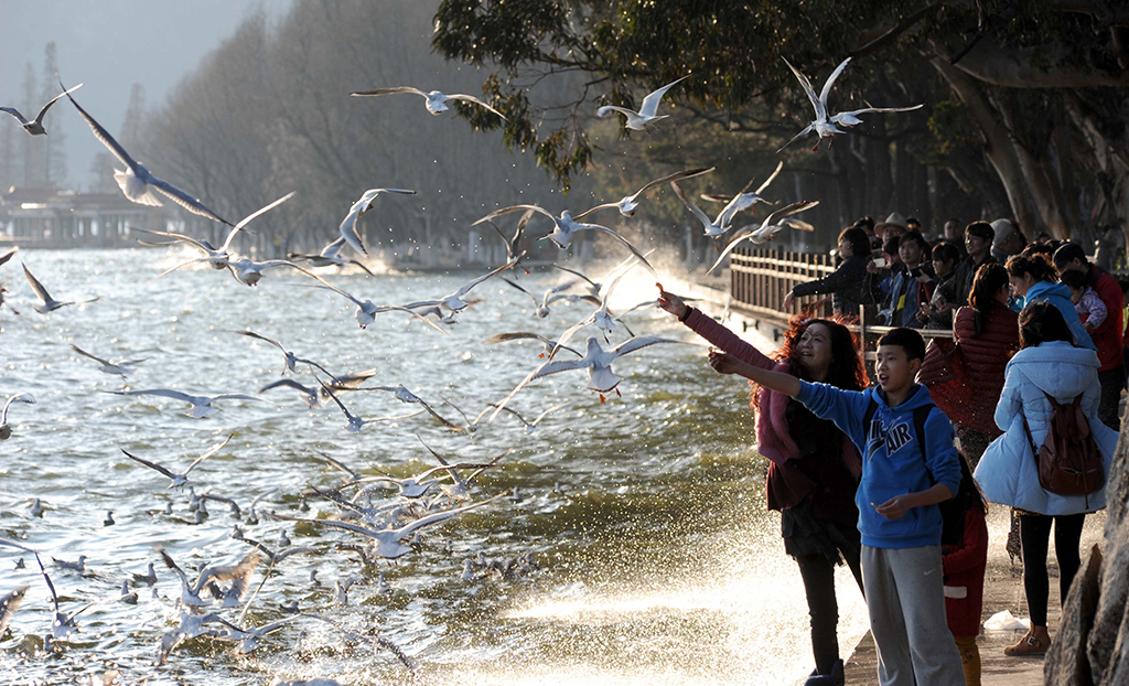 Visitors feed seagulls in Kunming. [Photo by Kunming Daily/provided to chinaservicesinfo.com]