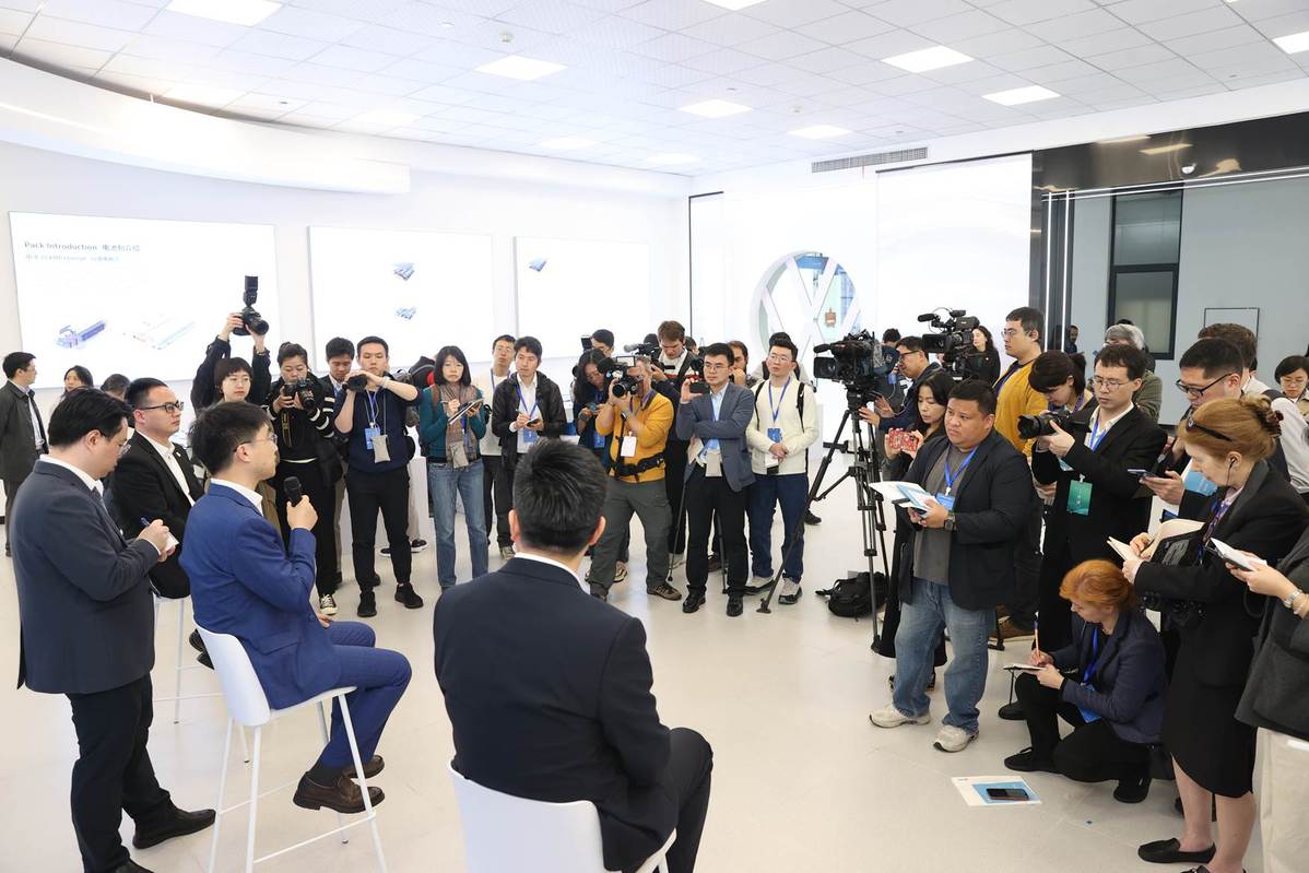 Executives from Gotion High-tech, a leading Chinese company focusing on power battery development and production, answer questions from international reporters in Hefei, Anhui on Friday.[Photo by Liu Weixin/For chinadaily.com.cn]