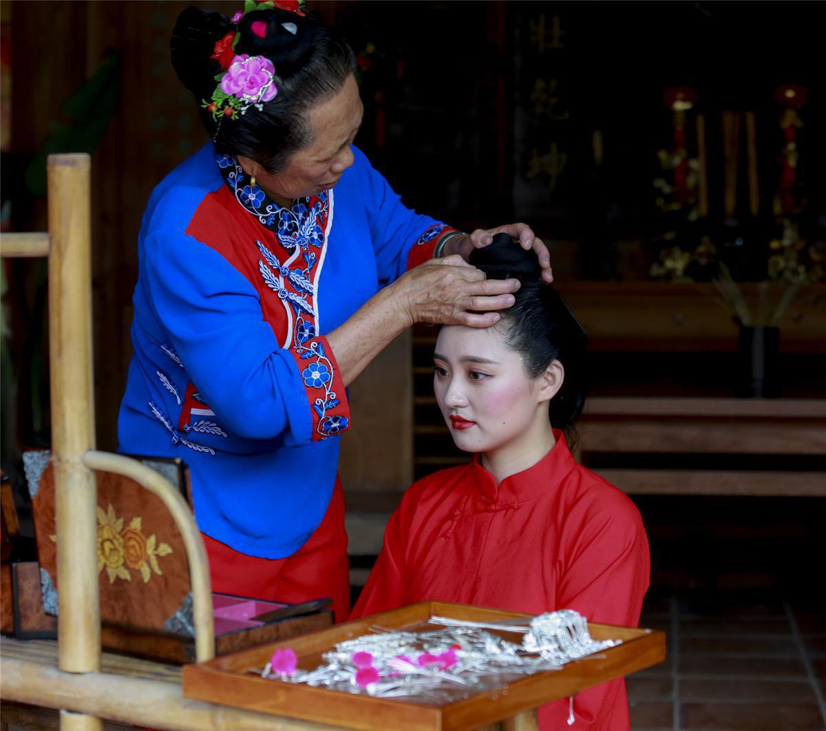 The traditional attire and headdress of the women of Meizhou Island in Putian, Fujian province, is a provincial intangible cultural heritage.