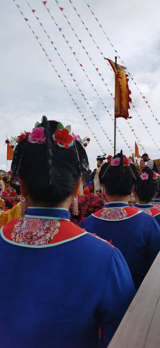 The traditional attire and headdress of the women of Meizhou Island in Putian, Fujian province, is a provincial intangible cultural heritage. [Photo by Ma Tianqi/for chinadaily.com.cn]