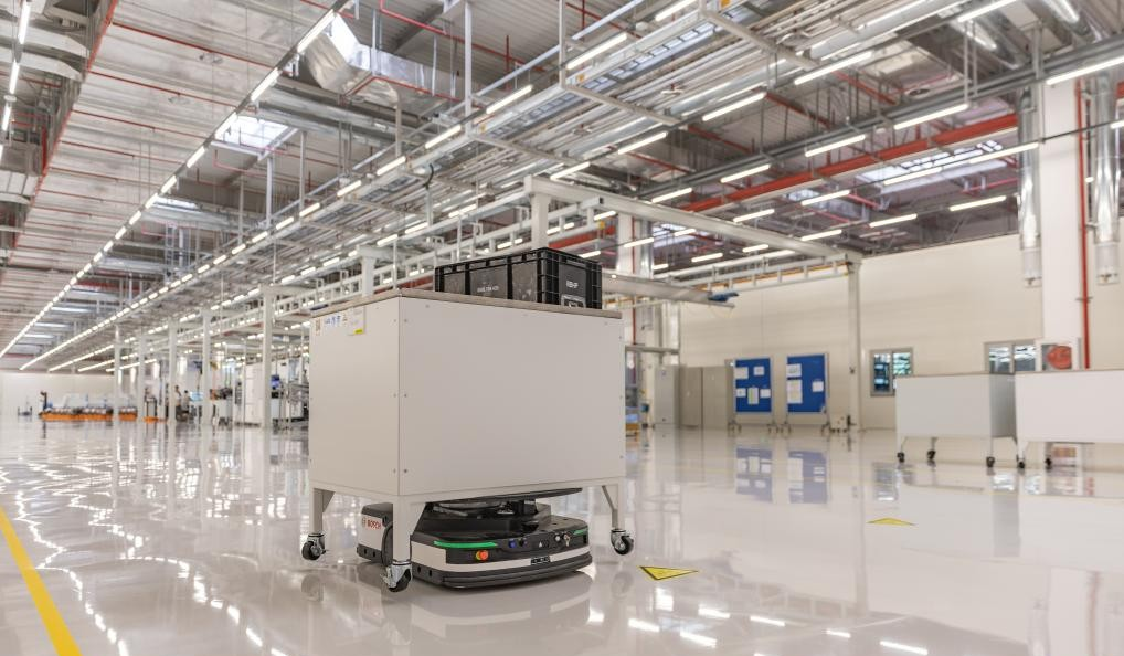 An intelligent AGV (Automated Guided Vehicle) transfers components at Bosch Hydrogen Powertrain Systems (Chongqing) Co Ltd in Southwest China's Chongqing municipality, April 19, 2024. [Photo/Xinhua]