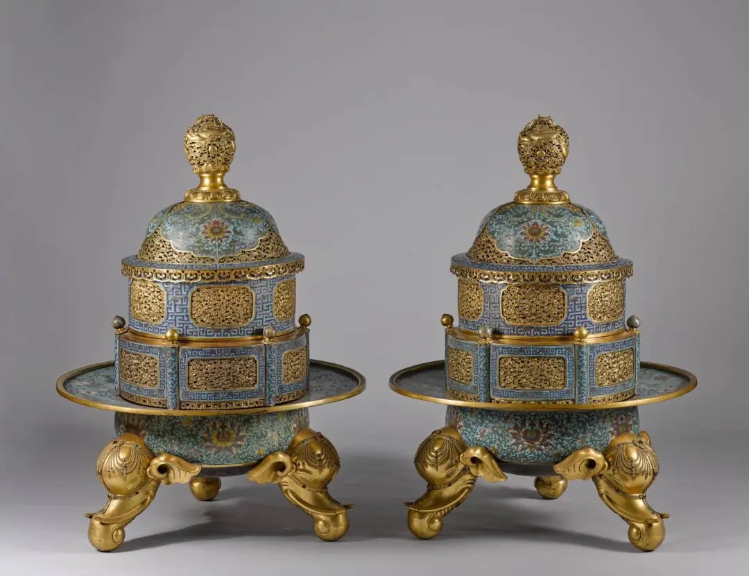A pair of cloisonné enamel incense burners with bird and flower motifs and elephant-shaped feet, Qing Dynasty [Photo/Official WeChat account of the Shanghai Museum]