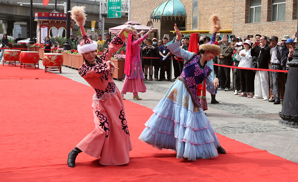 On April 24, actors and actresses performed traditional ethnic songs and dances for visitors at the Xinjiang International Grand Bazaar in Urumqi. The bazaar, meaning “market” in Uygur, covered 100,000 square meters and featured over 3,000 shops showcasing local unique architecture, cultural heritage, and diverse cuisine.