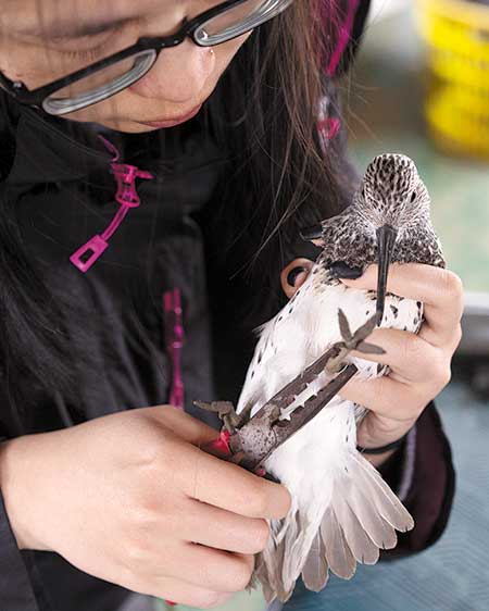 An Siwei, a Fudan University alumna who works at the reserve, measures a great knot bird to gather information for banding, a decadeslong task that involves attaching identification tags to the birds to track them and their routes.[Photo by Gao Erqiang/China Daily]