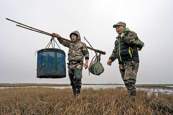 Gao Qianhua (holding equipment) and their mentor Jin Weiguo catch birds at the reserve for banding and identification.[Photo by Gao Erqiang/China Daily]