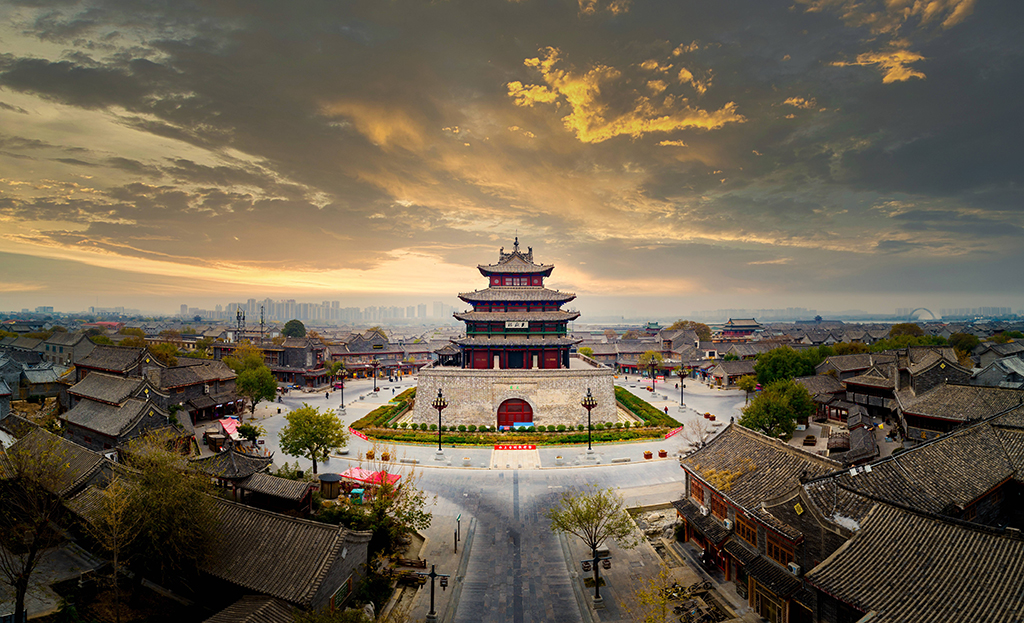 Aerial view of Guangyue Tower in golden light [Photo by Liaocheng Cultural and Tourism Development Center/provided to chinaservicesinfo.com]