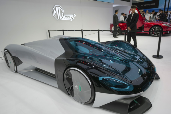 A staff member stands near a MG concept car at the 2024 Auto China in Beijing on April 25, 2024. [Photo/VCG]