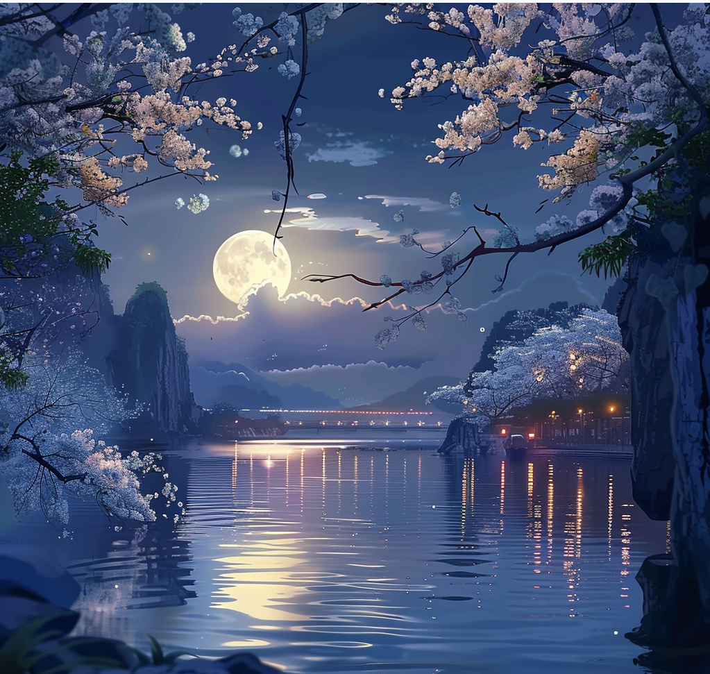 Inspired by the Tang Dynasty poem Blossoms on a Moonlit River in Spring by Zhang Ruoxu (670-730), this illustration incorporates the sparkling river described in the ancient poem, along with swaying flower shadows and bright moonlight, presenting a scene full of poetic and imaginative charm, with the river landscape as the main focus.