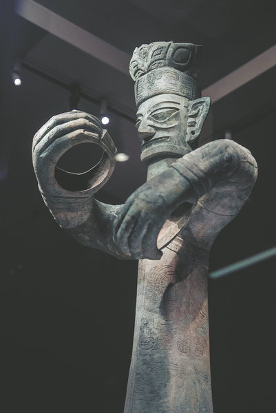 The reason is simple: barely a month before the discovery of the bronze man in August 1986, a 1.42-meter-long gold scepter was unearthed from the site. Weighing about half a kilogram, the scepter was made up of a layer of gold foil wrapped around a wooden stick. With its wooden core long rotted away, the gold scepter, so rumpled that it was initially thought to be a belt, has proved to be one of the biggest of its kind found in China, as well as the rest of the world.