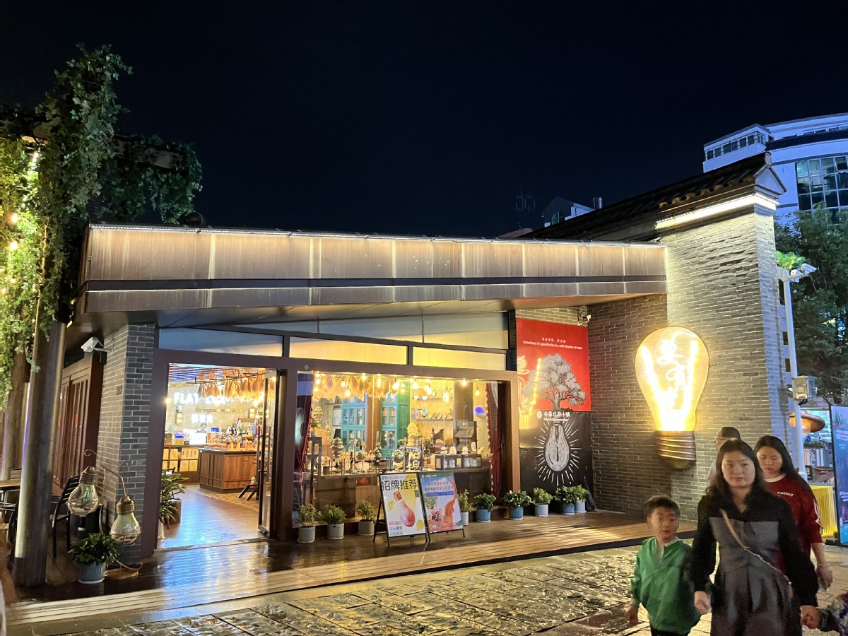 Visitors pass by a café at Huichang Theatre Village in Huichang county, Jiangxi province. [Photo by Chen Liubing/chinadaily.com.cn]