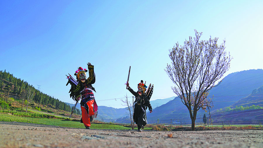 Zhou Ruwen and his grandson Zhou Hao rehearse for the opera in the open. [PHOTO BY ZI YU/ZHAI JIAN/GAO WEI/FOR CHINA DAILY]