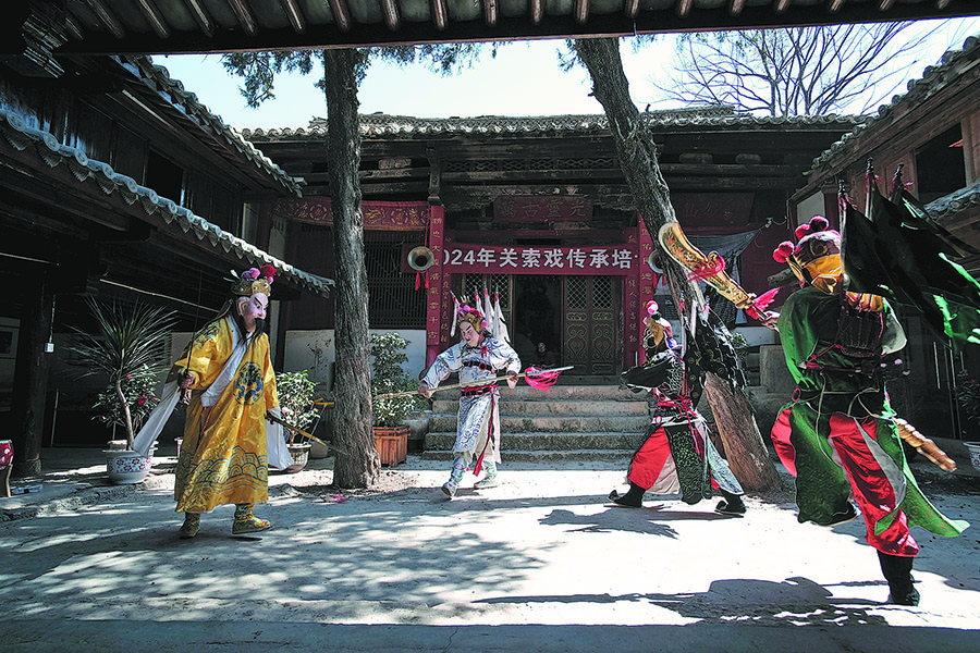 Guansuo Opera troupe members from Xiaotun village rehearse on the Lingfeng temple grounds. [PHOTO BY ZI YU/ZHAI JIAN/GAO WEI/FOR CHINA DAILY]