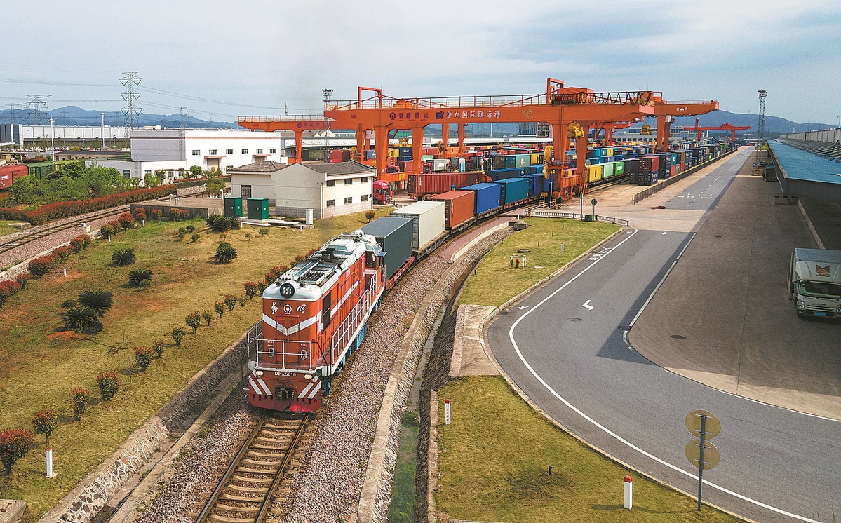 A freight train carrying 110 containers of household appliances and mechanical equipment departs from Jinhua, Zhejiang province, on its way to Budapest, Hungary, on April 1. HU XIAOFEI/FOR CHINA DAILY