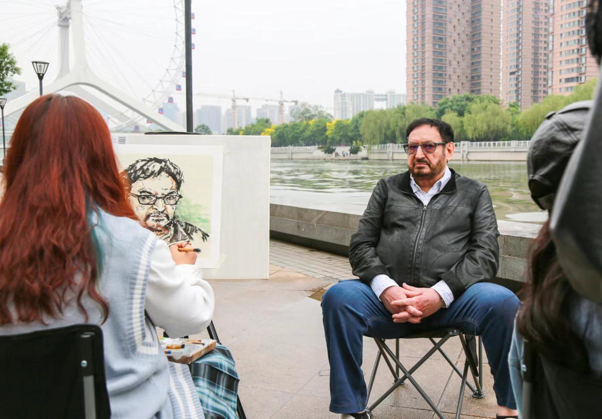 Renato Pegoraro, an Italian restaurant proprietor, sits for a portrait by a Tianjin Academy of Fine Arts student during an art event on May 5, 2024. [Photo provided to chinadaily.com.cn]