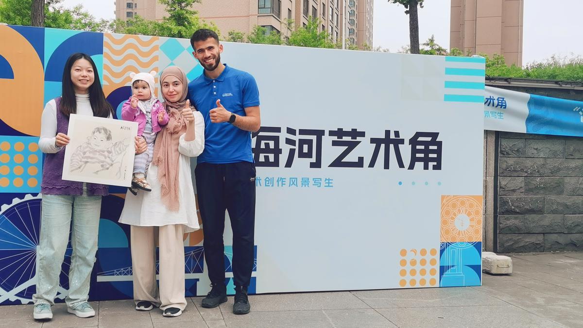 An international family receives their baby's portrait from a Tianjin Academy of Fine Arts student on May 5, 2024. [Photo provided to chinadaily.com.cn]