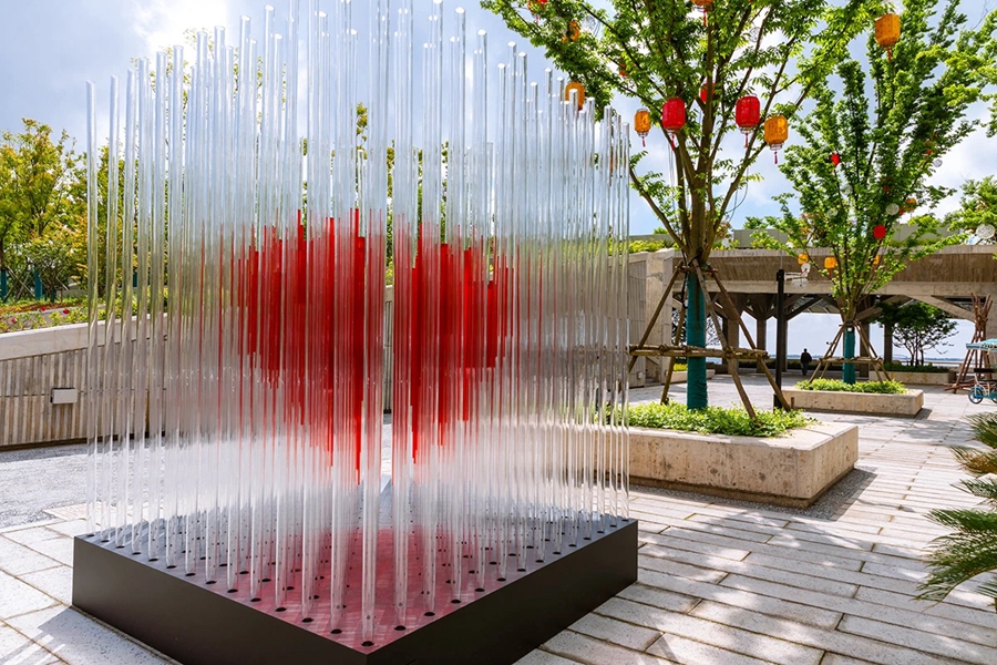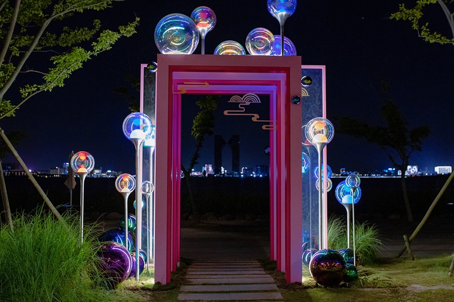 At the Dishui Lake pier there is now a cubic glass structure with a red heart inside it. [Photo/WeChat ID: shlgguanweihui]At Cloud Plaza, a striking oversized shopping bag in bright yellow stands out, offering tourists a picturesque backdrop with the bag as a frame and the lake view in the background for photo opportunities. [Photo/WeChat ID: shlgguanweihui]The gate of happiness in the One Step Garden (in the east bank store at Dishui Lake) is a favorite spot for wedding photoshoots. [Photo/WeChat ID: shlgguanweihui]