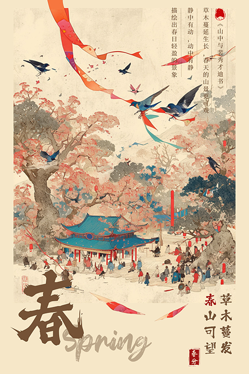 This group of AI-generated illustrations is themed on the four seasons, aiming to express the changes and beauty of each season through classical poetry. Each illustration features an ancient poem accompanied by images and elements representing the respective season. Through the combination of beautiful poetry and exquisite visuals, they convey the natural beauty of the changing seasons, allowing viewers to experience the rhythm of time and the cycle of life in a poetic context.