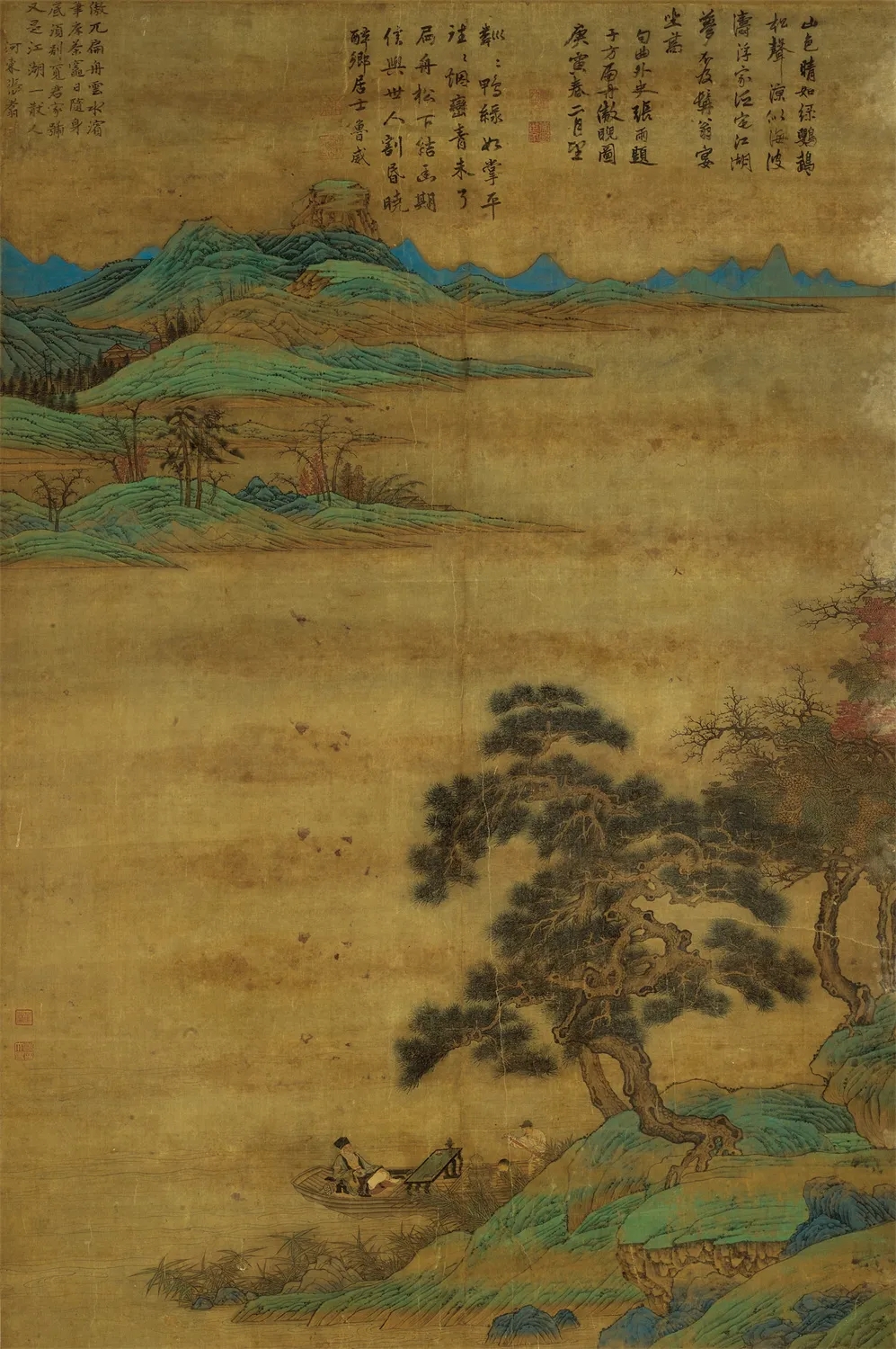 In this Yuan Dynasty (1271-1368) painting, a tranquil scene is captured. Distant rolling green mountains, a riverside with green pines and a lone boat by the shore. Inside the boat, an elderly literatus sits on a mat, leaning against a curved armrest. Scrolls wrapped in book covers rest beside him. A young attendant crouches nearby, preparing tea, and a boatman steers the boat. The painting brings to life the dignified demeanor of an ancient Chinese scholar and his pursuit of the serene simplicity of a reclusive rural life. Collection: Liaoning Provincial Museum.
