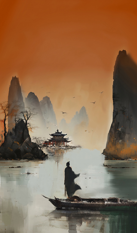 This illustration is inspired by the Tang Dynasty (618-907) poem The Yellow Crane Tower written by Cui Hao. The Yellow Crane Tower stands alone in the mountains, solitary and desolate. The surrounding landscape is barren, with falling leaves scattered about, and the former glory has faded away. The illustration aims to convey through painting the poignant and solitary mood of the poem, creating a sense of distant history and the passage of time.