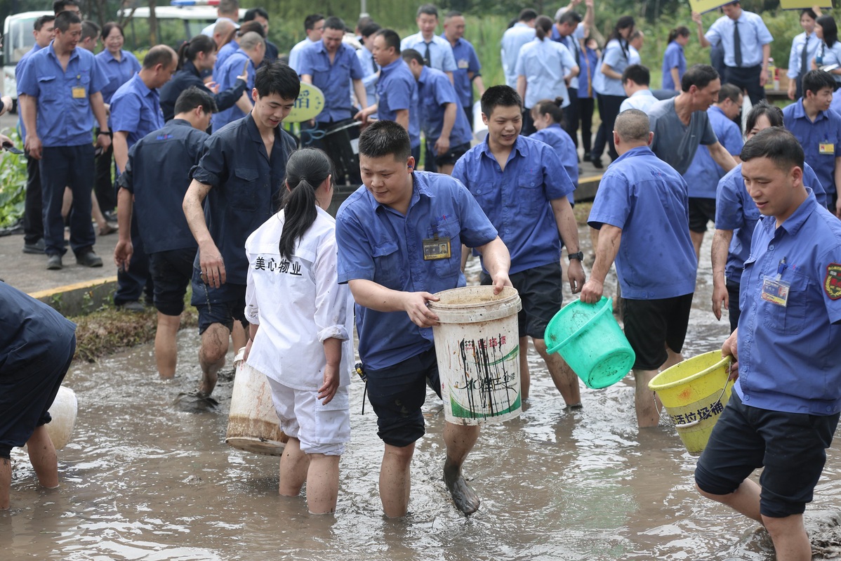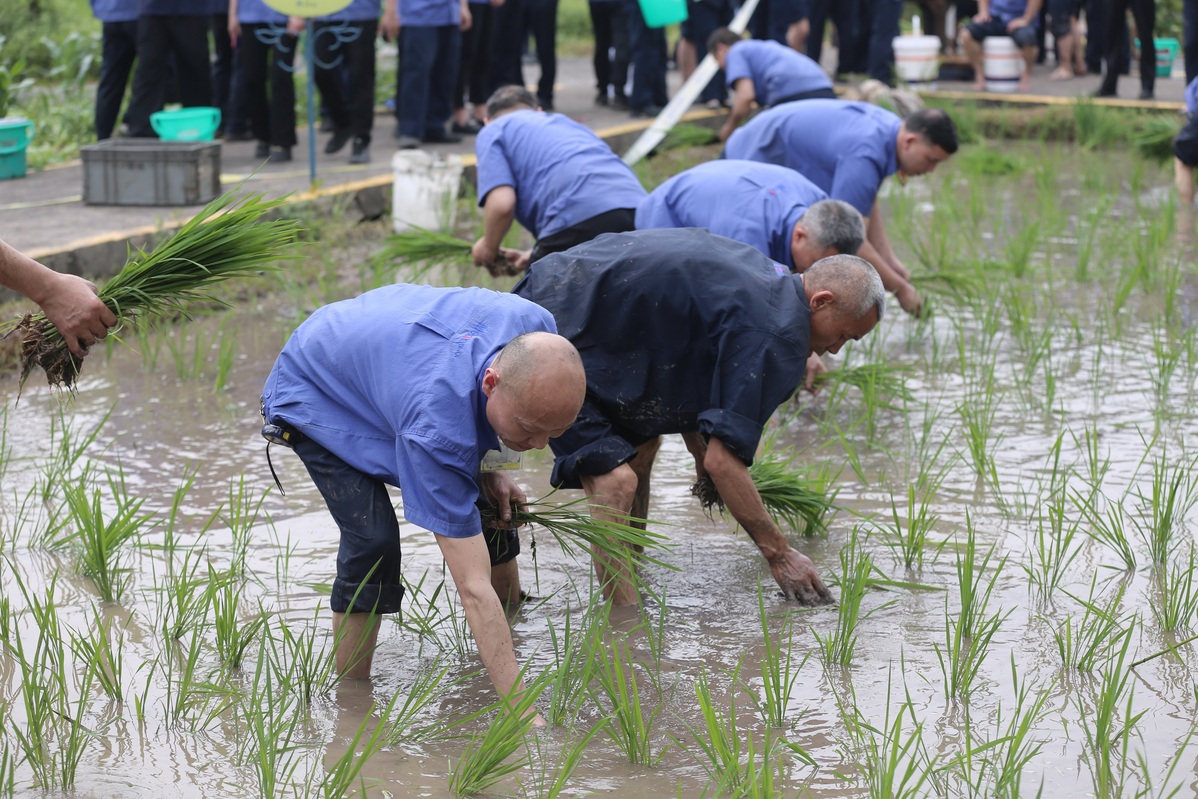 A group of employees at Chongqing Meixin Group rolled up their sleeves and pants on Tuesday morning and waded into a paddy field on their factory building's rooftop.