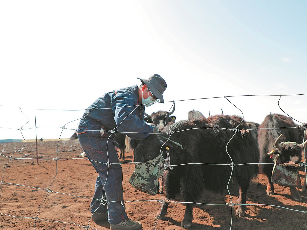 LANZHOU — Riding a motorcycle, Zhao Zhiwei, 30, skillfully drove some 30 yaks back to the shed where his classmate Cao Ze was waiting to hang a feeding bag onto each yak's horns.