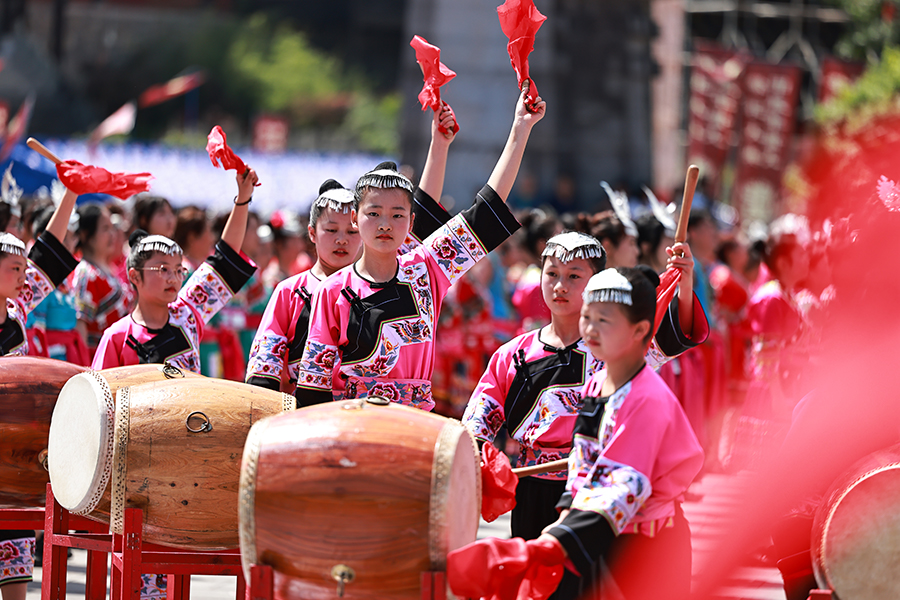 Performers in traditional Miao costumes are beating the drums to celebrate the Huashan Festival in Chiyou Jiuli Town, a 4A historical scenic spot located in Chongqing, May 15, 2024. [Photo by Su Zhigang/provided to chinadaily.com.cn]