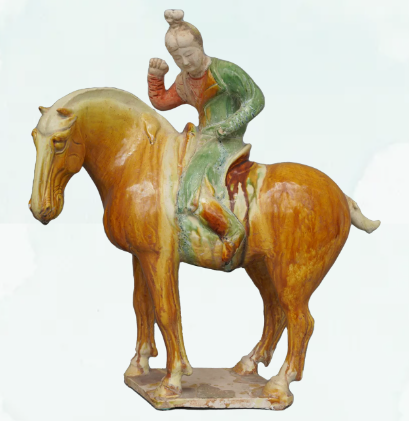 Tri-color glazed ceramic female figurine playing polo, Tang Dynasty (618-907), from the collection of the Luoyang City Cultural Relics and Archaeology Research Institute [Photo/Official WeChat account of the China Grand Canal Museum]