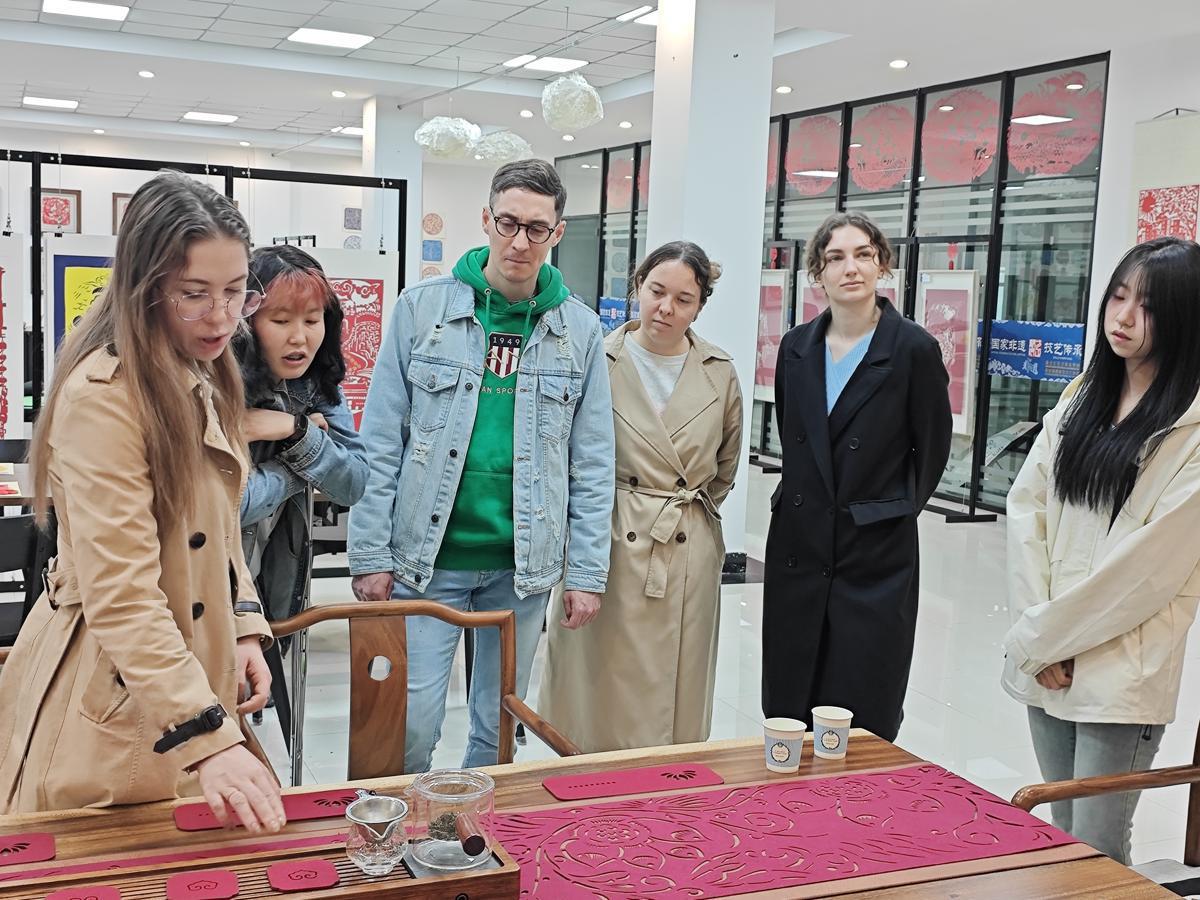 Students from Northeast Forestry University and Harbin Medical University were invited to learn the skills of Ni Xiumei, a national intangible cultural inheritor of paper-cutting, together with Chinese students at Heilongjiang College of Performing Art. The activity was part of Heilongjiang's second China-Russia Culture and Art Season.