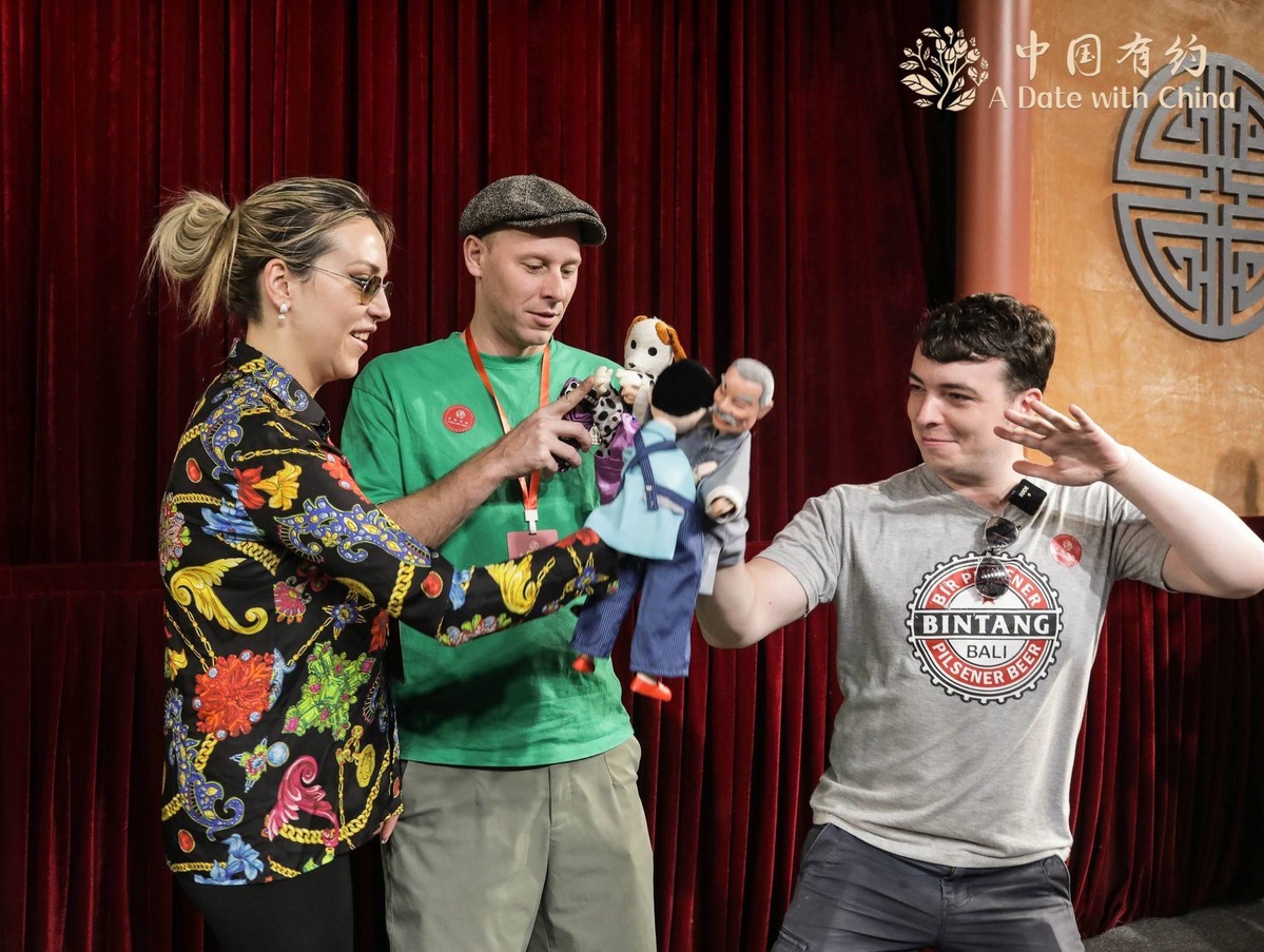 Members of the international media tour A Date with China learn to perform puppet shows in Zhangzhou, Fujian province, on May 19, 2024. [Photo/chinadaily.com.cn]