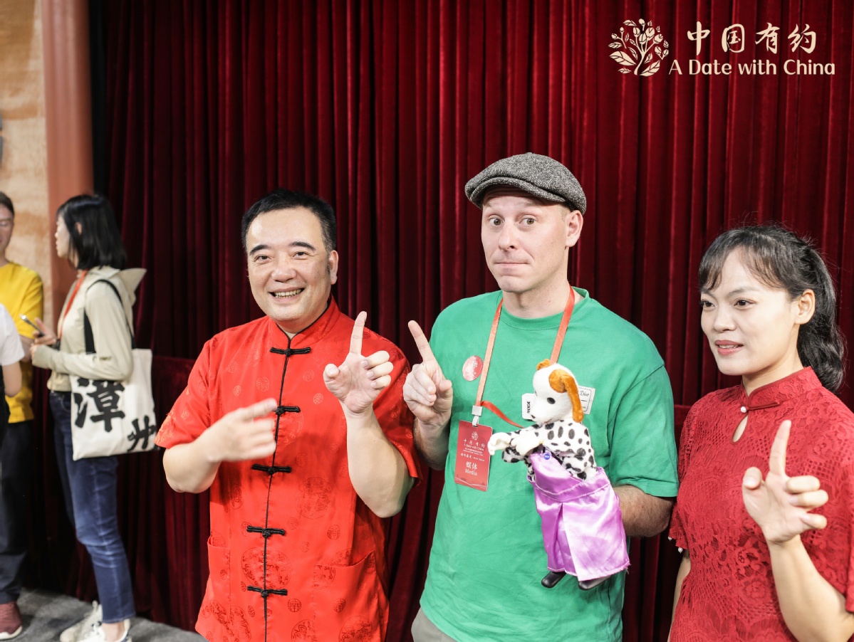 Members of the international media tour A Date with China learn to perform puppet shows in Zhangzhou, Fujian province, on May 19, 2024. [Photo/chinadaily.com.cn]