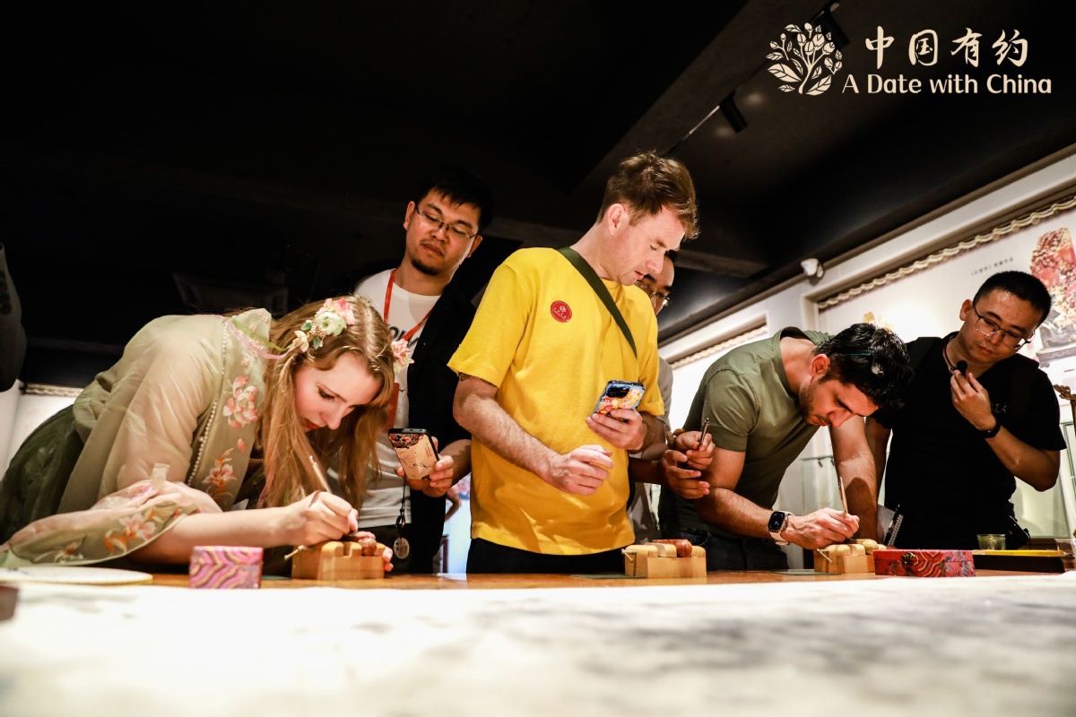 Members of the international media tour A Date with China experience traditional carving in Zhangzhou, Fujian province, on May 19, 2024. [Photo/chinadaily.com.cn]