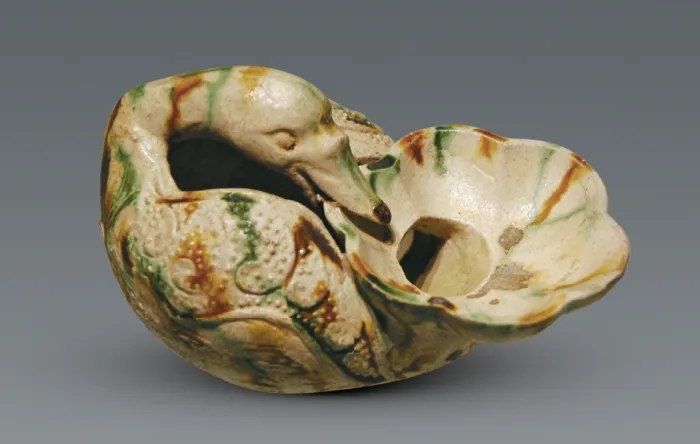 Any idea what this tri-color glazed duck-shaped artifact is used for? It’s a cup from the Tang Dynasty (618-907). The duck turns its head back with its beak holding its lotus leaf-shaped tail, which serves as the cup’s rim. This piece exudes graceful and delicate beauty with its soft and harmonious colors.