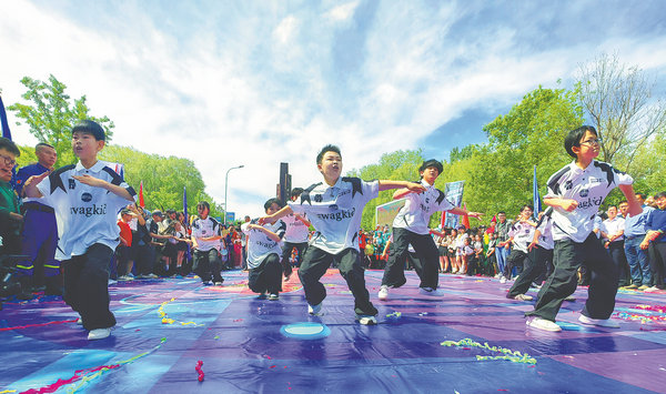 Young students perform modern dance at Chaobai River Wetland Park in Baodi district of Tianjin. [Photo provided to China Daily]