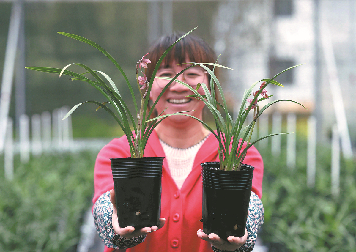 A worker poses with orchids from a research company's plot in Wengyuan county in Guangdong province. PARKER ZHENG/CHINA DAILY