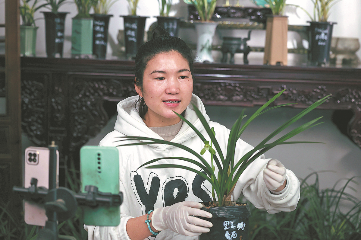 A farmer sells orchids through livestreaming. PARKER ZHENG/CHINA DAILY