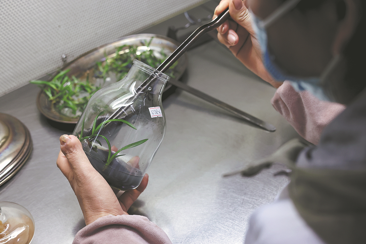 A researcher studies orchid seedlings in a laboratory in Wengyuan. PARKER ZHENG/CHINA DAILY