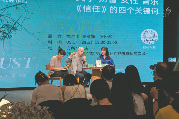 Pulitzer Prize-winning author Hernan Diaz (center, on stage) discusses literature, wealth, femininity and music during a dialogue with Chinese writer Zhang Yueran (right) in Beijing on May 17. CHINA DAILY
