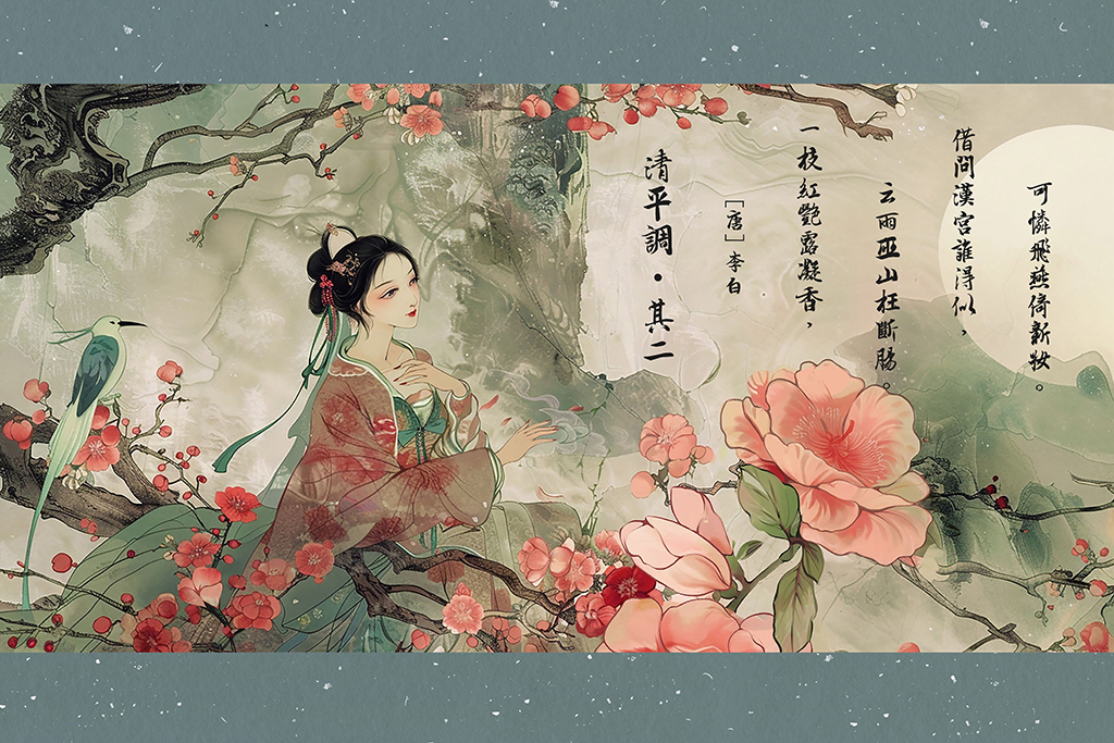 Inspired by the Tang Dynasty (618-907) poem Pure Peace Tune written by Li Bai (701-762), this illustration includes elements such as red flowers, mountain scenery, traditional touches, and birds. However, the poem mainly describes a woman's sorrowful thoughts, so the illustration also incorporates an ancient woman to match the slightly melancholic atmosphere.