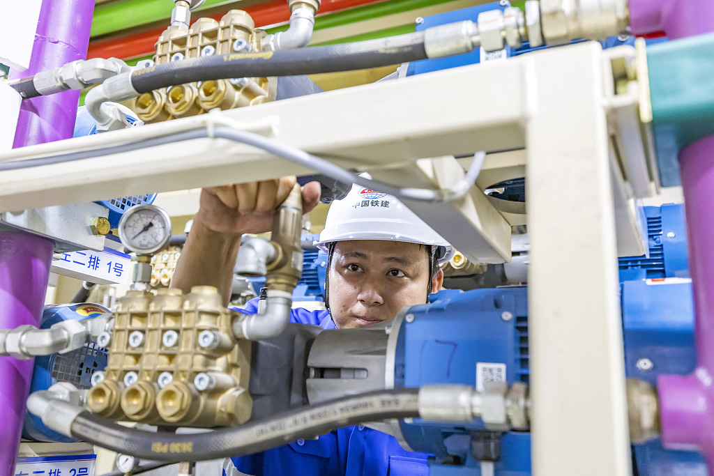 A worker at the construction site of Shenzhen-Dongguan tunnel west section of Shenzhen - Jiangmen Railway, South China's Guangdong province, May 30, 2024. [Photo/VCG]