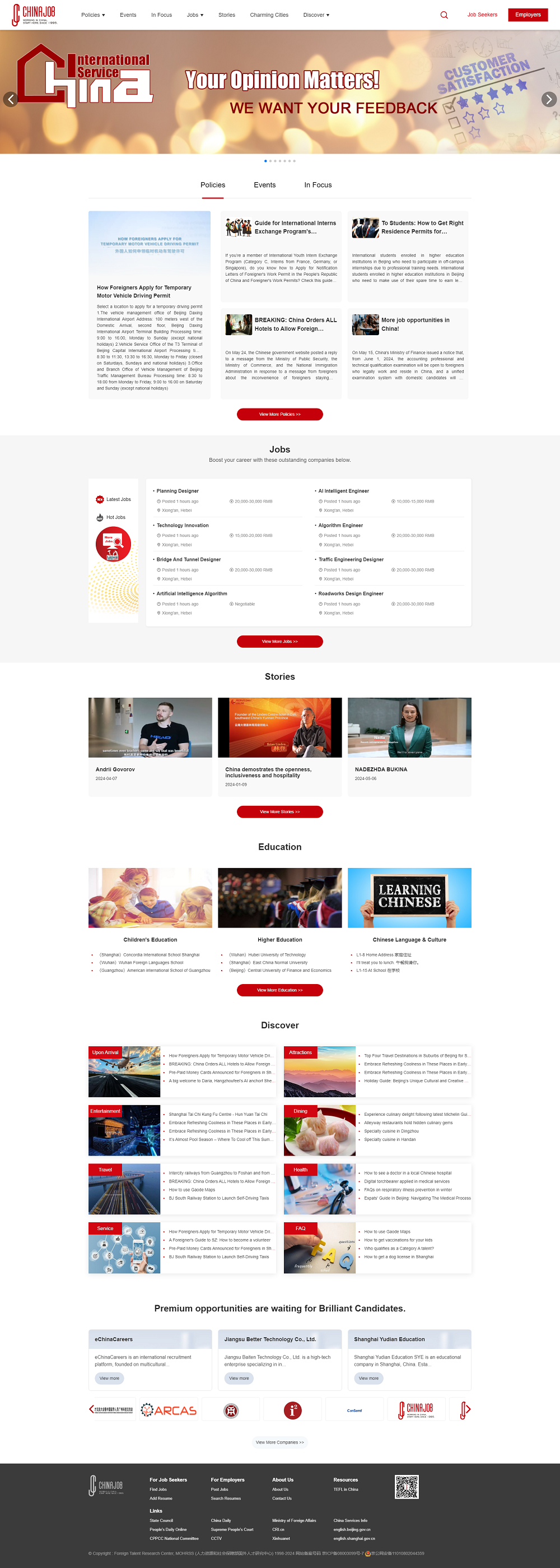 On June 3, the “China International Service Platform” (www.chinajob.com) was officially launched by the Foreign Talent Research Center of the Ministry of Human Resources and Social Security. This platform is a comprehensive upgrade of foreign talent services nationwide, focusing on foreign talent and aiming to enhance the convenience and comfort of foreign talents who work and live in China. The purpose is to help foreign talents integrate more quickly into the Chinese society by providing them with comprehensive information services that have the characteristics of "full-chain, integrated, convenient, online and offline service".