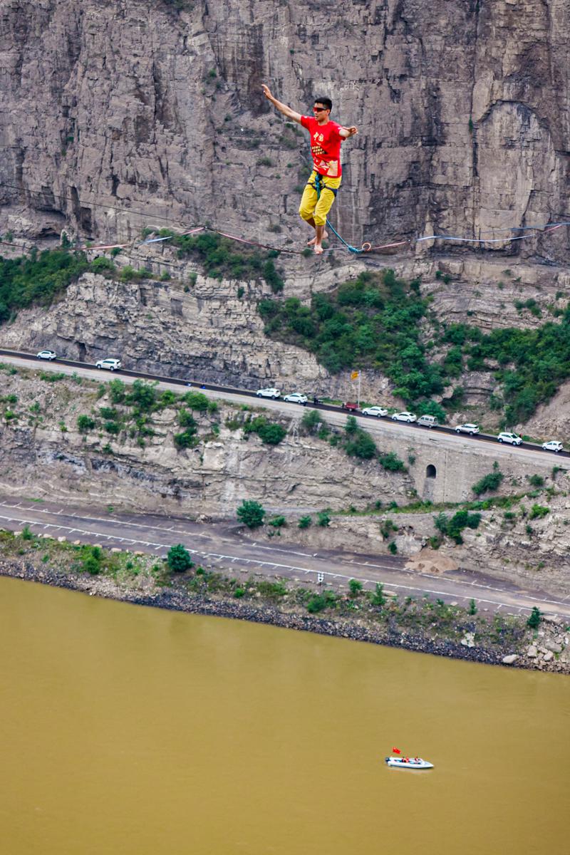 Chinese slackline athlete Shi Linhai set a new Asian record for walking on a slackline high above the Yellow River in North China's Shanxi province on June 2, 2024. [Photo provided to chinadaily.com.cn]